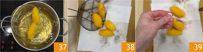 Drain the fried quenelles 37 and transfer them to paper towels 38, then salt to taste 39.