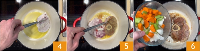 Place the veal shanks in a pot with a drizzle of hot oil (we used a casserole suitable for oven cooking; alternatively, you can transfer them to a baking dish later) 4 and brown them over medium heat for 3 minutes on each side 5. When they are well browned, add the vegetables 6.