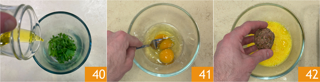 For the parsley oil, let the chopped parsley infuse in the extra virgin olive oil for at least 5 minutes 40. In the meantime, focus on breading and frying the meatballs: heat the seed oil to a temperature of 340°F. Beat the eggs in a separate bowl 41 and dip the meatballs in the beaten egg 41.