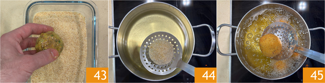 Also coat the meatballs with the breadcrumbs 43. Immerse 1-2 meatballs at a time in hot oil 44 and fry for about 3-4 minutes. When they are beautifully golden, drain 45 on paper towels.