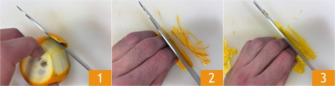 To prepare the veal strips with cashews, wash 2 lemons and 2 oranges. Then take the oranges and peel them with a sharp knife 1 removing only the orange part, as the white would be bitter. Then cut the peel into very thin strips 2 and do the same with the lemons 3.