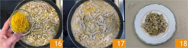 Add half of the blanched peels 16 and mix well 17. Let the sauce reduce and thicken; the strips will cook for about 15 minutes in total. Serve your veal strips with cashews garnished with chopped chives and citrus peels to taste 18!