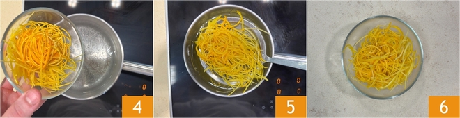 Blanch the peels for 2 minutes in boiling water 4, then drain well 5 and transfer to a bowl 6. Squeeze all the citrus fruits and set the juice aside.