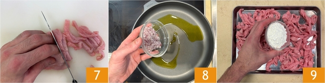 Cut the veal into strips 7. Finely chop the shallot and brown it in a large pan with a drizzle of oil 8. Meanwhile, place the meat in a tray and sprinkle the corn starch over it 9.