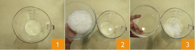 To prepare the soy vegan butter, first pour the soy milk into a jug 1. Then add the coconut oil 2 and the lemon juice 3.