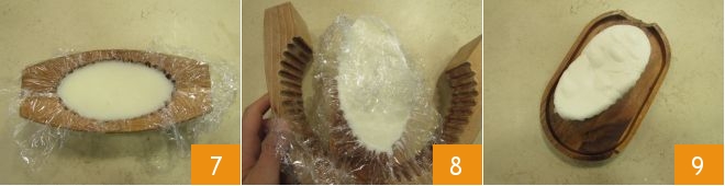 Then pour the mixture inside 7 and let it solidify for at least 3 hours in the refrigerator. After this time, open the mold 8, remove the plastic wrap, and use your soy vegan butter for preparing sweet and savory dishes 9!