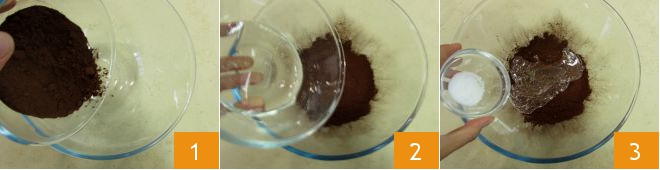 To prepare the vegan dessert with cocoa and black cherries, pour the unsweetened cocoa powder 1, glucose syrup 2, and salt 3 into a bowl