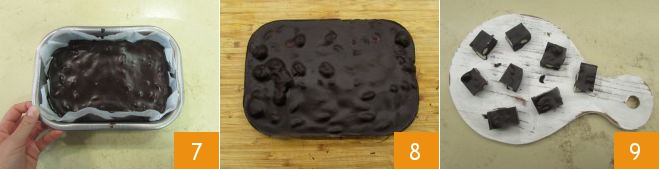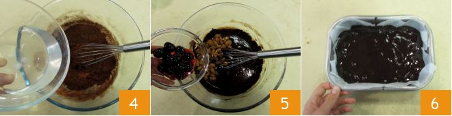 and the coconut oil 4. Mix until you obtain a homogeneous mixture. Add the whole almonds and syruped black cherries 5. Line a 20x10 cm (8x4 inches) rectangular mold with parchment paper and pour the mixture into it 6.