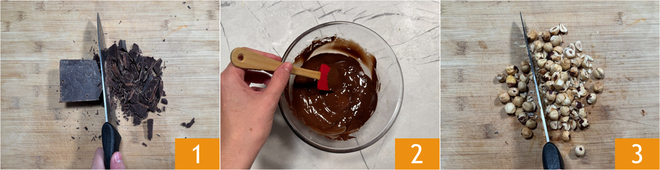 Finally pit and chop the dates 7, then press them with the blade of the knife to obtain a paste 8. We recommend not leaving them too coarse. Add the dates to the melted chocolate 9 and combine with a rubber spatula.