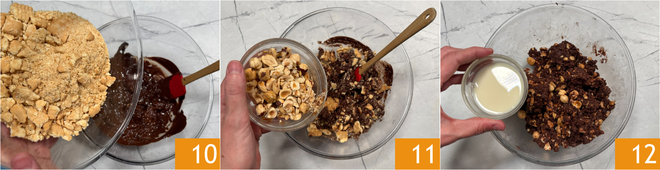 Also add the crumbled cookies 10, the chopped hazelnuts 11 and the oat milk 12, mixing as you go.