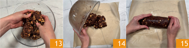 Continue to knead with your hands until you obtain a firm and homogeneous mixture 13. Pour the mixture onto a sheet of parchment paper 14 and shape it into a cylinder 15.