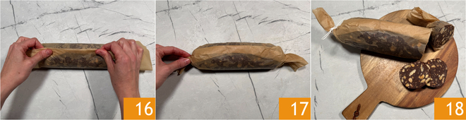Wrap the parchment paper around the cylinder 16 and twist the ends to seal it 17. Place in the refrigerator for at least 2 hours. After chilling, let the vegan chocolate salami return to room temperature for about 20 minutes before enjoying it 18!