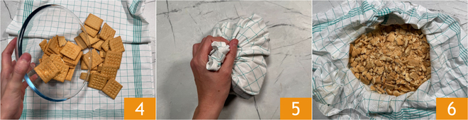 Place the plain crunchy cookies in a clean kitchen towel 4, then close it like a bundle and hit it on the work surface 5 to break them into irregular pieces so as to reduce them to coarse crumbs of various sizes 6.