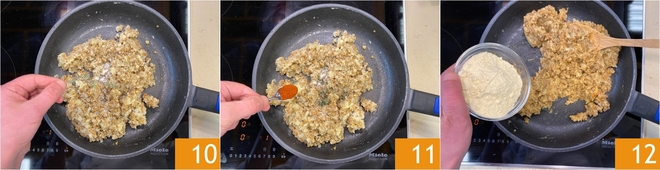 Flavor the vegan sausage mixture with fresh thyme 10 and sweet paprika 11. At this point, add the chickpea flour 12