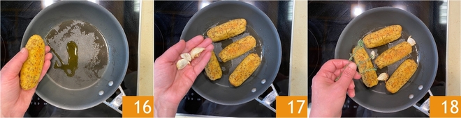Heat a pan with extra virgin olive oil and place the chilled sausages 16. Flavor with garlic cloves 17 and fresh thyme 18
