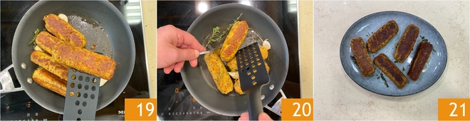 Cook the sausages for about 10 minutes over medium heat 19, turning them gently, being careful not to break them 19. Once golden on all sides, the vegan sausages are ready to be served 21!
