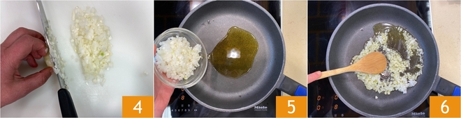 Peel and finely chop the onion 4 and add it to the pan along with the extra virgin olive oil 5. Let it stew in the pan for about 8 minutes over medium-low heat 6.