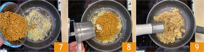 Once the onion is stewed, add the drained pre-cooked lentils to the pan 7 and, with the help of a potato masher, also add the boiled potatoes 8. Season with a pinch of salt 9 and pepper.