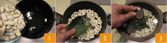 To prepare the vegan shepherd’s pie, first, soak the dry beans for about 12 hours, then pour them into a pot with plenty of water 1, add the bay leaves 2, and cook for at least 2 hours 3. The beans should be cooked but not falling apart.