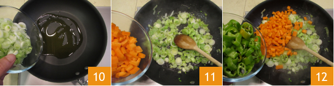 Pour the spring onions into a large pan with a drizzle of oil 10 and let them wilt for a few minutes, then add the carrots 11 and friggitelli 12.