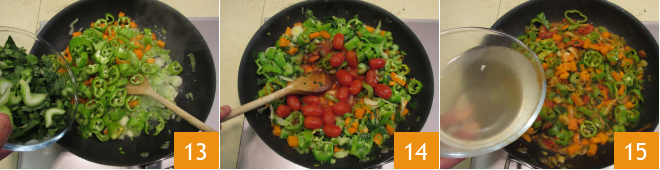 Add the celery 13, stir and sauté over medium heat for a couple of minutes, then pour in the peeled tomatoes 14 and 400 ml of water 15.