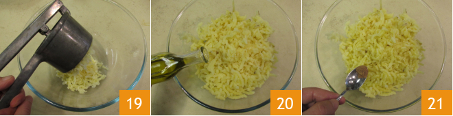 In the meantime, the potatoes will be cooked, so mash them in a large bowl 19 and season with oil 20 and nutmeg 21.