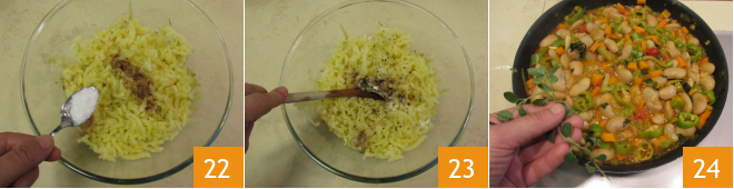 Add salt 22 and pepper as well, and mix to obtain a smooth puree 23. After the vegetables have cooked, season with fresh oregano leaves 34.