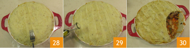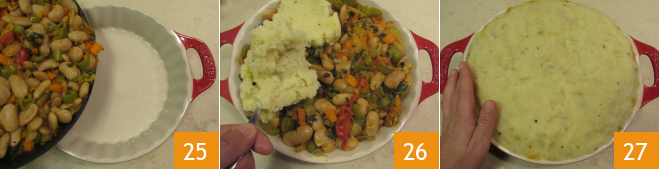 Now pour the vegetable and bean mixture into a baking dish with a base diameter of 9 inches and a top diameter of 11 inches 25, then cover everything with the mashed potatoes 26. Spread the puree evenly with your hands, making sure to cover the edges well 27.