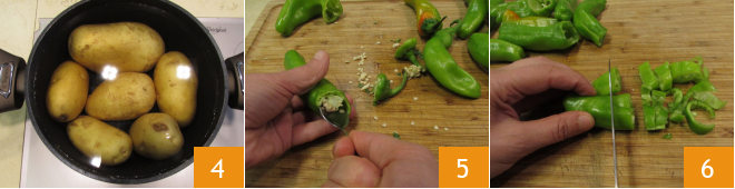 Also, boil the potatoes for about 30-40 minutes, depending on their size 4. Meanwhile, prepare the rest of the ingredients: remove the top end of the friggitelli and remove the seeds inside 5, then cut them into pieces 6.