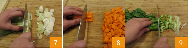 Clean and cut into pieces the spring onions 7, carrots 8, and celery, with all its leaves 9.