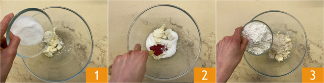To prepare the vegan tart, start with the dough for the vegan shortcrust pastry: in a bowl combine the vegan butter with the sugar 1 and work with a rubber spatula to blend them 2. When you have a creamy mixture, add the Type 1 flour and the chestnut flour 3.