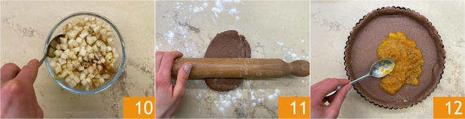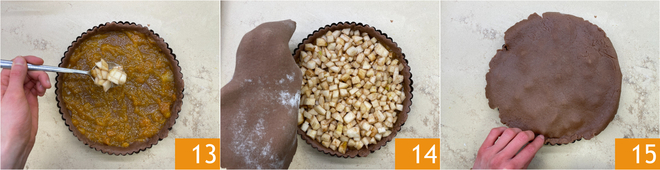 Add the pear cubes 13 and cover with the second layer of shortcrust pastry 14. Seal the edges well by pressing with your fingers 15.