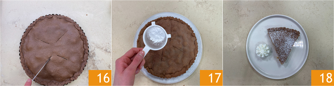 Make 4 slits on the surface 16 and bake in a conventional oven preheated to 356°F for about 40 minutes, placing the pan on the lowest rack. Once baked, remove from the oven and let cool completely, then dust with powdered sugar 17. Your vegan tart is ready to be served with a dollop of whipped vegan cream, if desired 18!