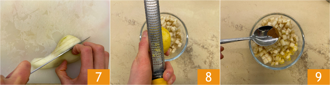 Meanwhile peel and core the pears; you should obtain about 1 lb of flesh, to be cut into cubes of about 3/8 inch 7. Transfer the pears to a bowl and flavor with grated lemon zest 8 and cinnamon 9.