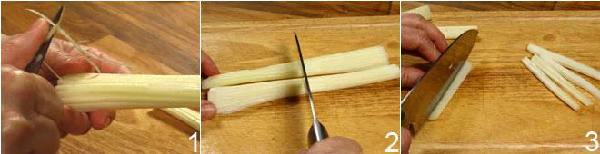Choose two tender celery stalks (the inner ones from the bunch of celery), remove the leaves at the ends, and eliminate any strings 1 by cutting into the base of each rib and pulling towards the opposite end. Cut the stalks into two parts of equal length 2 and then make sticks by cutting the pieces obtained lengthwise 3.