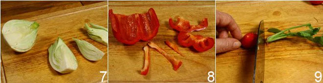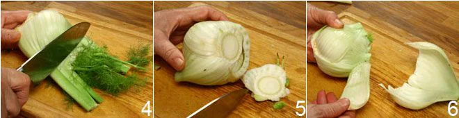 Take the fennel, remove the ends with the leaves 4 and then also the opposite end 5; remove the outer fleshy leaves that are more tough 6 and then cut the fennel into four equal parts which you will further reduce in half 7.