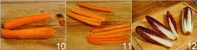 Peel the carrots, trim them 10, and cut them into parallel slices which you will then divide into sticks 11. Remove the damaged outer leaves of the radicchio and keep the fresh and intact ones by detaching them from the base 12. Divide the cut vegetables into small cups and prepare 4 bowls containing high-quality extra virgin olive oil. Place additional seasonings in the center of the table to enrich the dip and let each diner prepare it according to their taste. To prepare the dip, simply mix together oil, lemon, salt, and pepper in a bowl and beat vigorously with a fork to emulsify everything. Serve your vegetable sticks with the dip.