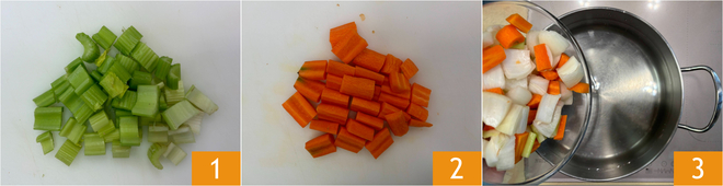 Meanwhile, finely chop the onion 4, carrot 5, and celery 6.