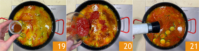 Add the paprika 19 and tomato puree 20. Adjust salt and pepper 21