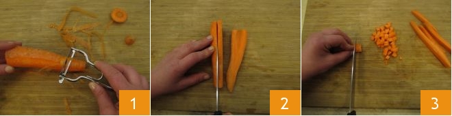 To prepare the vegetable plumcake, start by peeling the carrot 1, then trim it and slice it 2, and finally cut it into small cubes 3.