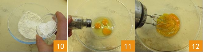Now prepare the batter: pour the flour and instant yeast for savory dishes 10 previously sifted, into a bowl. Then crack the eggs into another bowl, add salt and pepper 11, and start beating them with an electric mixer 12.