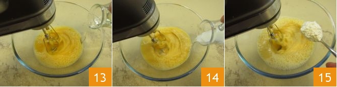 When they become frothy, gradually add the oil 13 and then the milk, still slowly. Continue to beat while adding the flour mixed with the yeast little by little 15.