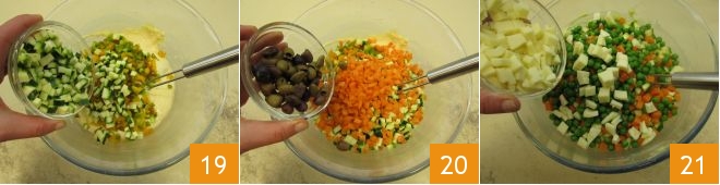 then the zucchinis 19, carrots, whole but pitted Taggiasca olives 20, peas, and scamorza cheese cubes 21.