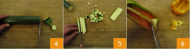 Wash the zucchini, trim it 4, and cut it to the same size as the carrots 5. Wash the bell peppers as well, cut them in half, then remove the stem, white filaments, and seeds 6.