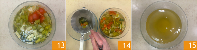 Once cooking is done 13, strain the vegetables using a colander 14. The microwave vegetable stock is ready 15 to be used in your recipes.