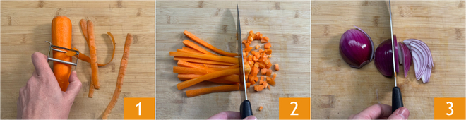 To prepare the vegetarian meatballs, first peel the carrot 1, then cut it into strips and then into cubes of 0.2-0.3 inches 2. Slice the onions finely 3.