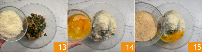 Add the Parmesan 13, eggs 14, and breadcrumbs 15.