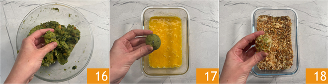 Mix the ingredients to obtain a moldable mixture 16. Form the meatballs, about 1.2 oz each, and dip them first in the eggs 17 and then in the coarse breadcrumbs 18.