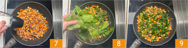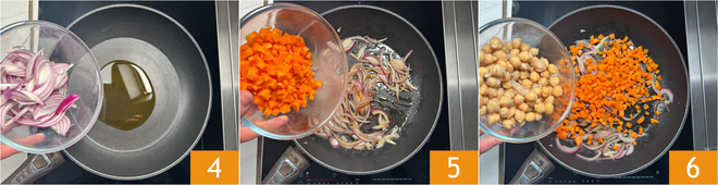 In a non-stick pan, pour a dash of oil, add the onions 4, and sauté over medium-low heat for about 4 minutes or until they are soft and golden. Add the carrots 5 and well-drained chickpeas 6.