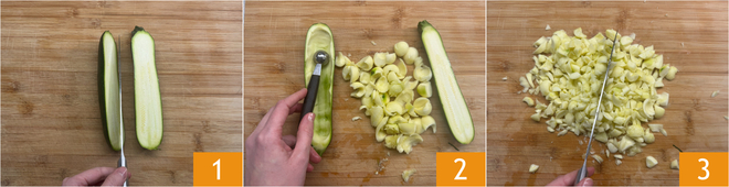 To prepare the vegetarian stuffed zucchini, first cut the zucchinis in half lengthwise 1, then scoop out the flesh, preferably with a small scoop or melon baller 2. Roughly chop the flesh with a knife 3.